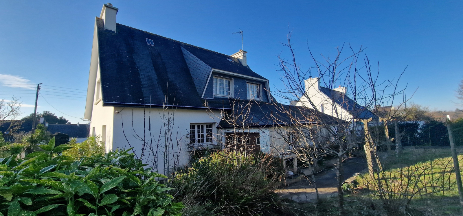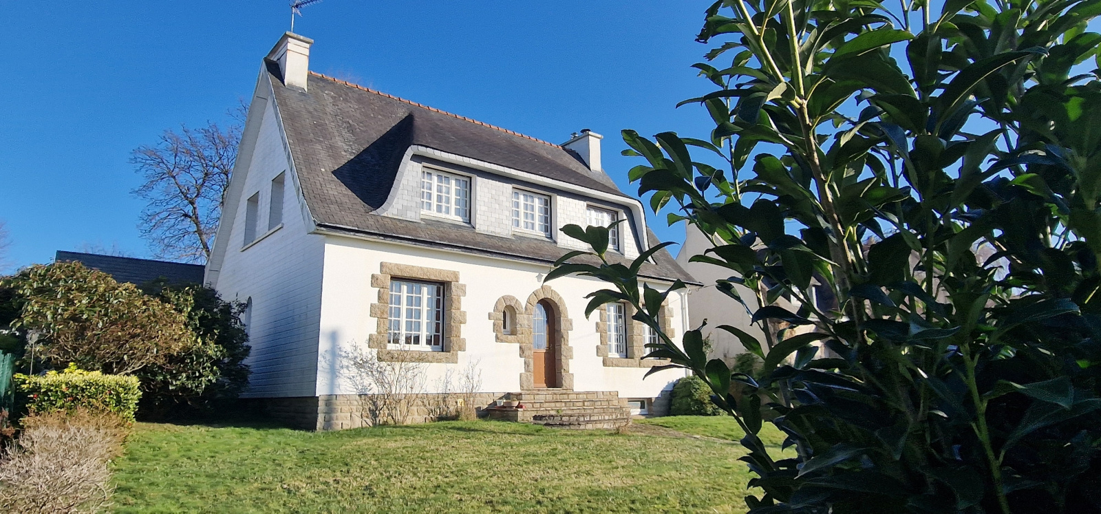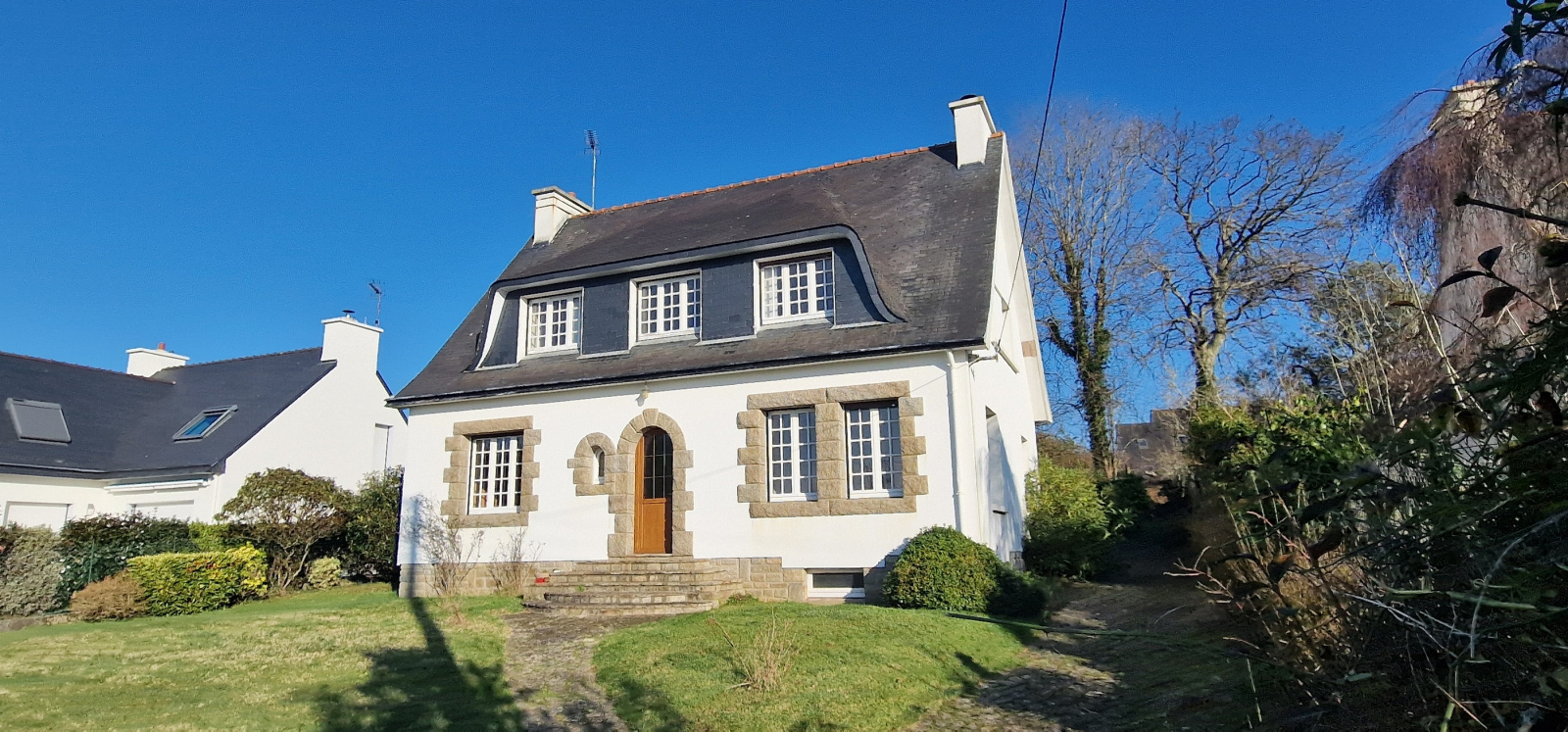 Quimperlé. A proximité du centre-ville. Sur les hauteurs. Dans un quartier résidentiel recherché. Au calme. De beaux volumes pour cette maison traditionnelle qui profite d'une vue sur la ville. Elle comprend, au rez-de-chaussée : entrée, salon-séjour avec cheminée-insert, cuisine, une chambre, salle de bains, buanderie et wc ; à l'étage : palier, quatre chambres dont deux en enfilade, salle de bains et wc. Cave. Grand garage. Très agréable jardin arboré de 1100 m². Maison saine à moderniser ! (Les informations sur les risques auxquels ce bien est exposé sont disponibles sur le site Géorisques : www.georisques.gouv.fr).