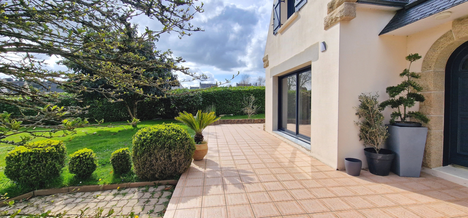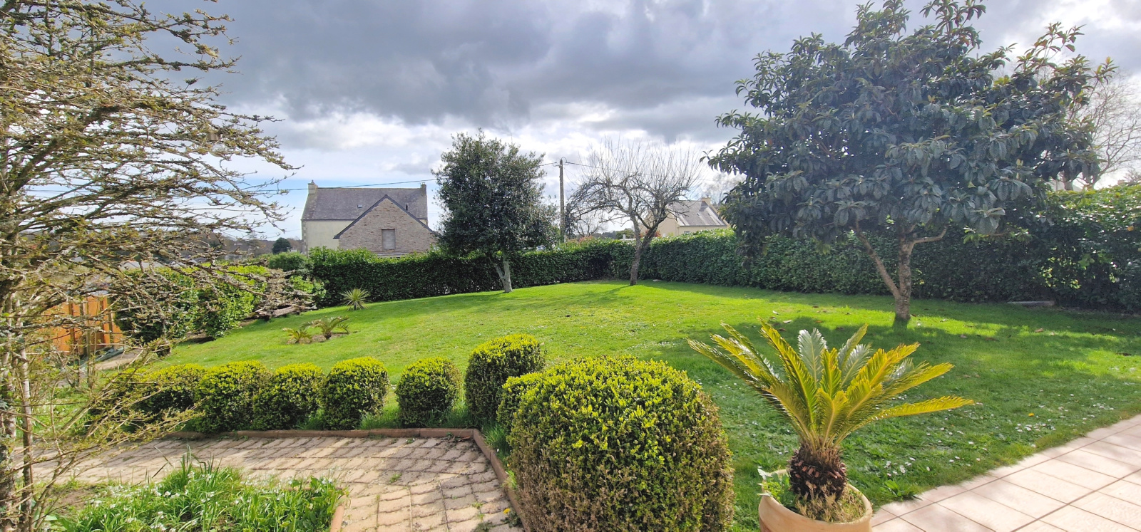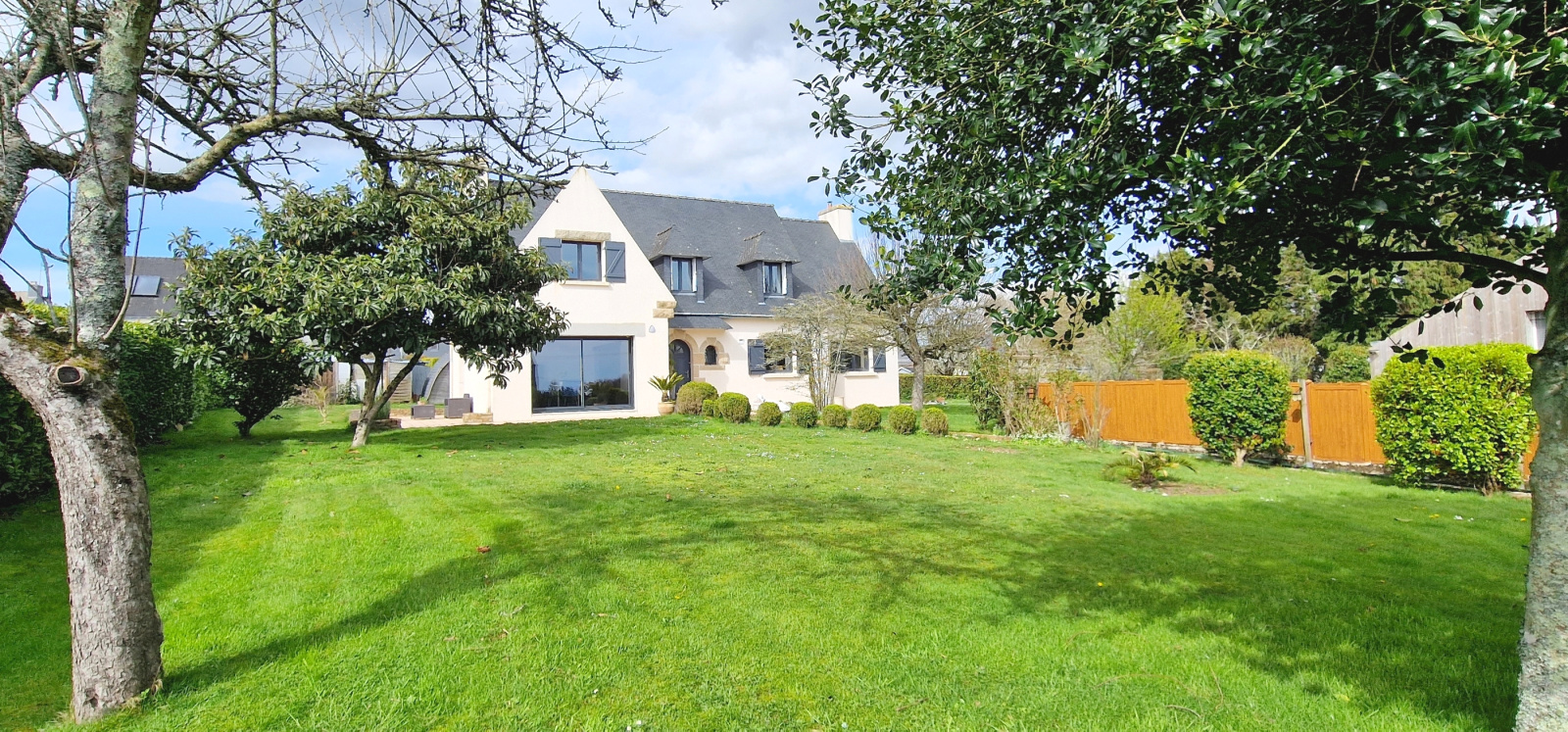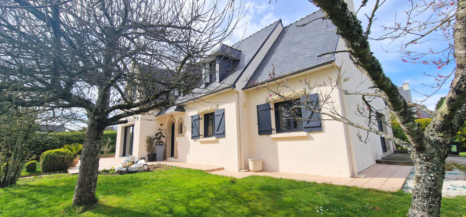 Cléguer. A 15 km de Lorient et 3 km du bourg (commerces et écoles). Axe Lorient-Roscoff et arrêt de bus à proximité immédiate. Dans un quartier résidentiel calme. Aucun vis-à-vis pour cette maison traditionnelle de 1995 et modernisée en 2022. Fonctionnelle et spacieuse, elle offre, au rez-de-chaussée : entrée avec placard, salon-séjour avec poêle à granules, cuisine aménagée et équipée, une chambre, salle d'eau et wc ; à l'étage : palier, quatre chambres, salle de bains et wc. Grenier (rangement). Garage. Chauffage par pompe à chaleur (installation en 2022). Terrasse carrelée et exposée sud. Très beau jardin arboré (nombreux fruitiers) et cloturé, de 1788 m². Abris de jardin. Assainissement collectif. Excellent état ! Maison familiale très accueillante !